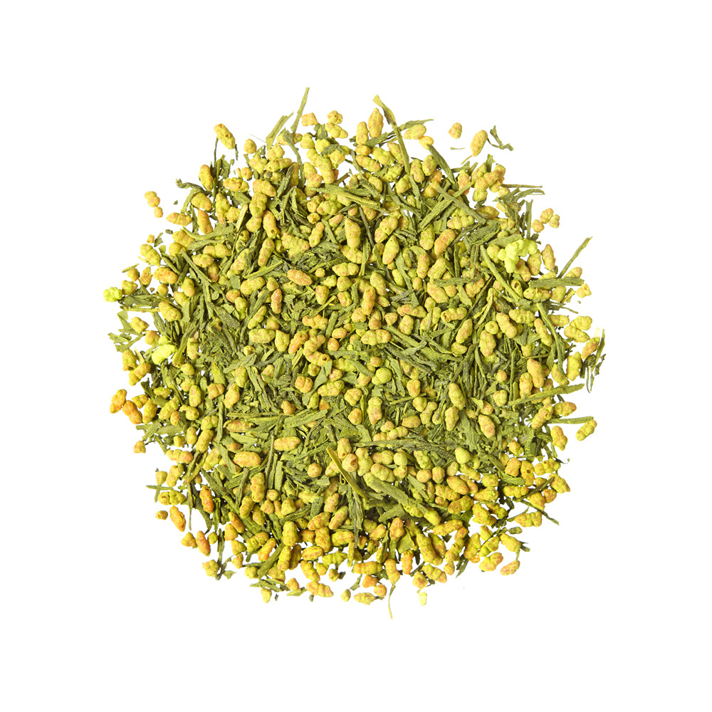 Classique Thé Vert japonais Genmaicha renforcé avec du Thé Matcha en poudre. Un mélange BIO au goût grillé et intense, riche en chlorophylle et en polyphénols.