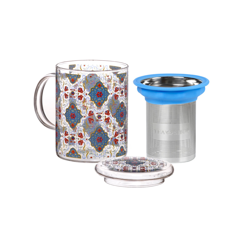 Elegante y funcional taza de cristal termorresistente con infusor de acero inoxidable, recubrimiento de silicona y exclusivo diseño mediterráneo de Tea Shop