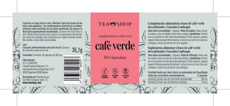 Extracto de Café Verde descafeinado y Garcinia Cambogia. La Garcinia es un fruto que ayuda al control del peso ya que ayuda a la reducción de almacenamiento de grasa en el organismo, además de producir un efecto saciante.
