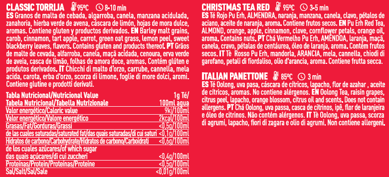 Christmas Tea Red es la expresión depurativa de la Navidad, con un sabor cálido e intenso que ofrece un festivo inolvidable. Italian Panettone celebra al rey de todas las fiestas, “Il Panettone”, en una base de té oolong acompañada de dulce pasa sultana y un delicado toque cítrico, creando una experiencia elegante y festiva. Classic Torrija reinventa el clásico postre español en una infusión digestiva y vitamínica, brindando una bebida deliciosa y saludable para disfrutar con tranquilidad. Almacenar en un lugar fresco y seco. Caja completamente reciclable.