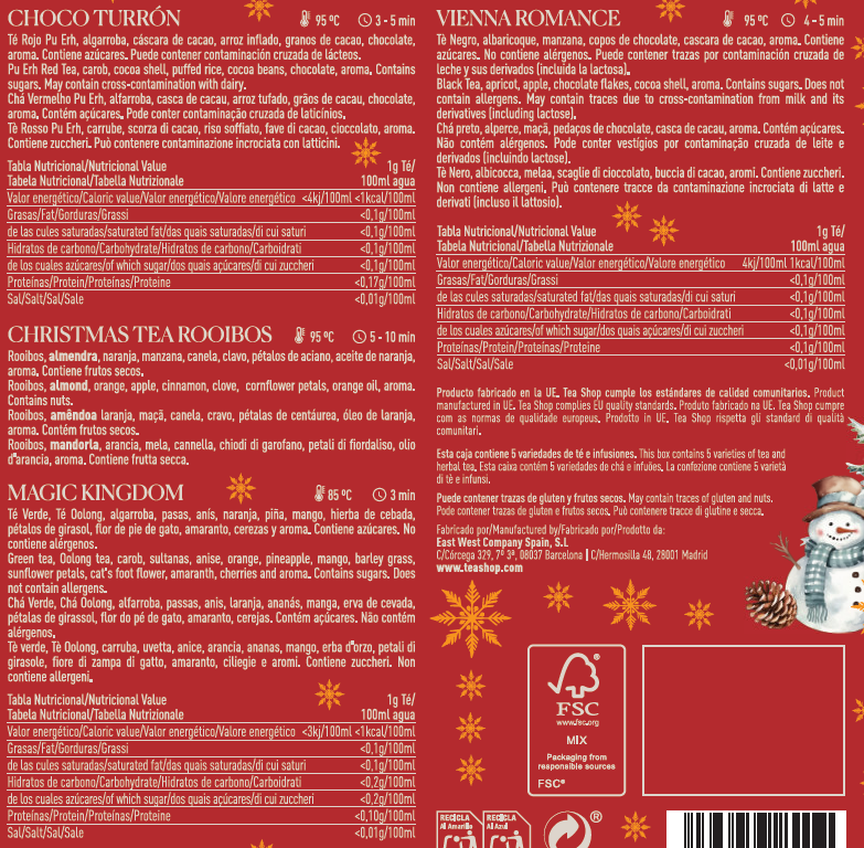 Magic Kingdom es una cabalgata de sabores y colores que combina fruta confitada y anís en una base de té verde y té oolong, ofreciendo una experiencia alegre y mágica. Choco Turrón evoca la tradición dulce de las fiestas con una crujiente y golosa mezcla de té rojo Pu Erh que se deshace en la boca, creando un momento cálido y reconfortante. Sweet Turrón es la expresión más relajante de la Navidad, donde el turrón clásico se transforma en una infusión festiva y acogedora para disfrutar del invierno. Christmas Tea Rooibos destaca por su riqueza mineral y vitamínica, ofreciendo una mezcla reconfortante y festiva, perfecta para crear momentos de bienestar durante las fiestas. Vienna Romance combina la elegancia del té negro con albaricoque y chocolate, brindando un viaje dulce y afrutado inspirado en el icónico postre vienés. Almacenar en un lugar fresco y seco. Caja completamente reciclable.