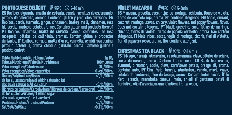 Christmas Tea Black ofrece un cálido e intenso sabor que captura la energía de la Navidad para un festivo inolvidable. Portuguese Delight invita a un viaje a la fantasía gastronómica de Lisboa con su infusión dulce y cremosa, inspirada en la famosa tartaleta de hojaldre con crema. Violet Macaron evoca la elegancia de un clásico dulce francés con delicadas notas florales, para un momento de pura sofisticación.