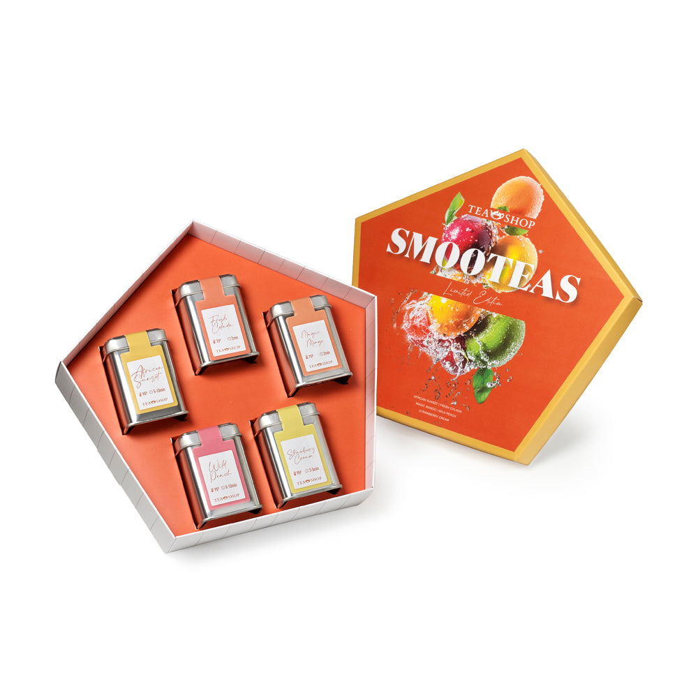 Una selección de Tés e Infusiones para tus mejores Smooteas: African Sunset, Fresh Colada, Magic Mango, Wild Peach, Strawberry Cream