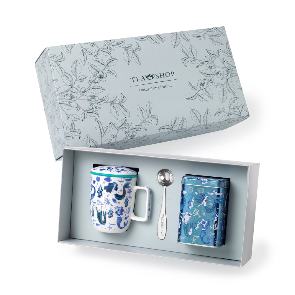 Set que incluye los utensilios necesarios para iniciarse en el mundo del té: Una taza con infusor y tapa, una lata de 100g y una medida