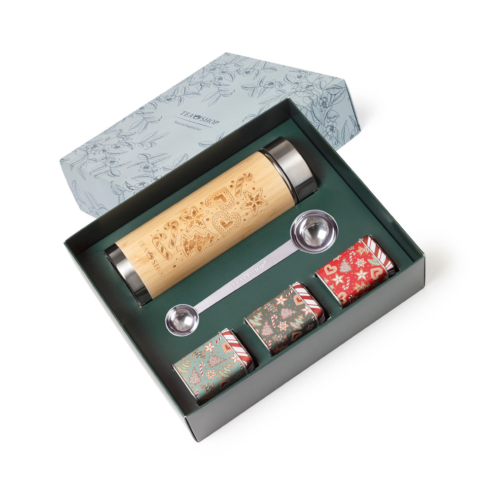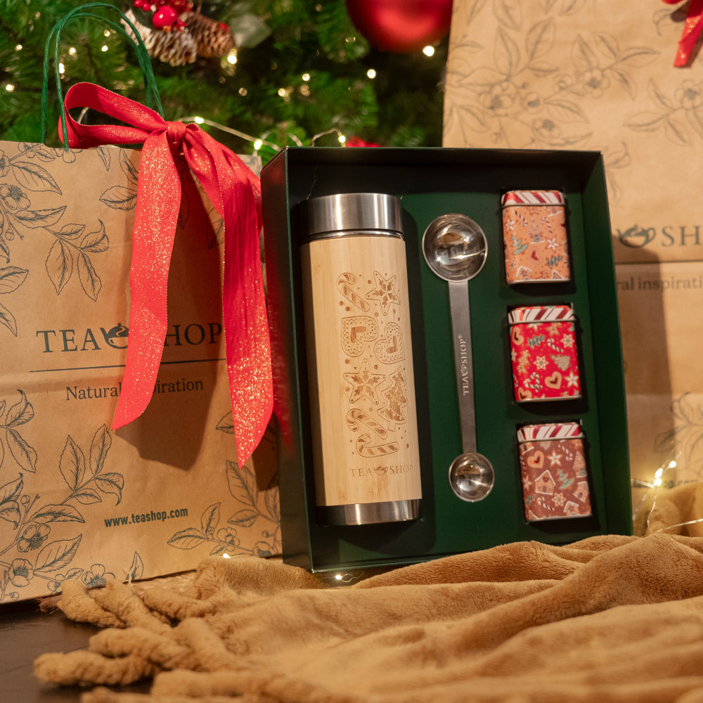 El set perfecto para regalar a los amantes del té: Termo de 400ml con infusor, decorado con encantadoras figuras de galletas navideñas, como estrellas, corazones y bastones de caramelo, 3 latitas de edición limitada con tés inspirados en postres navideños: 25g Té Negro CheesecakeTea, 25g Infusión Sweet Turrón, 25g Té Rojo Pu Erh Tearamisu y una medida dúo para que el té quede perfecto. ✨