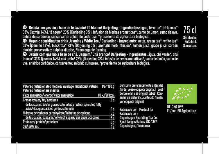 Producto con ingredientes 100% orgánicos. Su base de 13 tés distintos le aportan notas aromáticas florales de jazmín, suavidad y elegancia; además de un sabor complejo y duradero que lo convierten en un acompañamiento ideal para aperitivos, entrantes, platos principales ligeros y postres. Contiene sulfitos. Se recomienda consumir a 5ºC en copa de champagne.