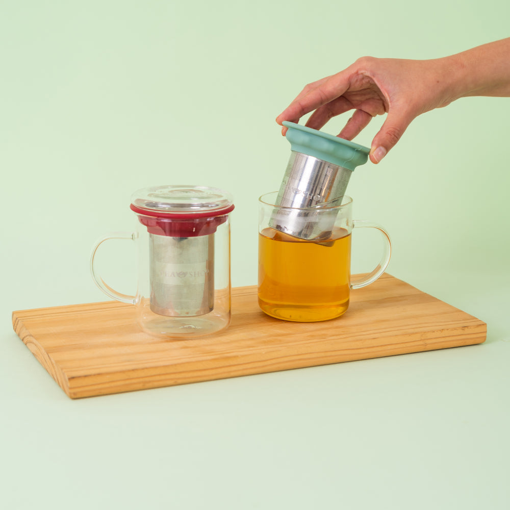 Elegante e funcional caneca de vidro termoresistente com infusor em aço inoxidável e coberture de silicone.